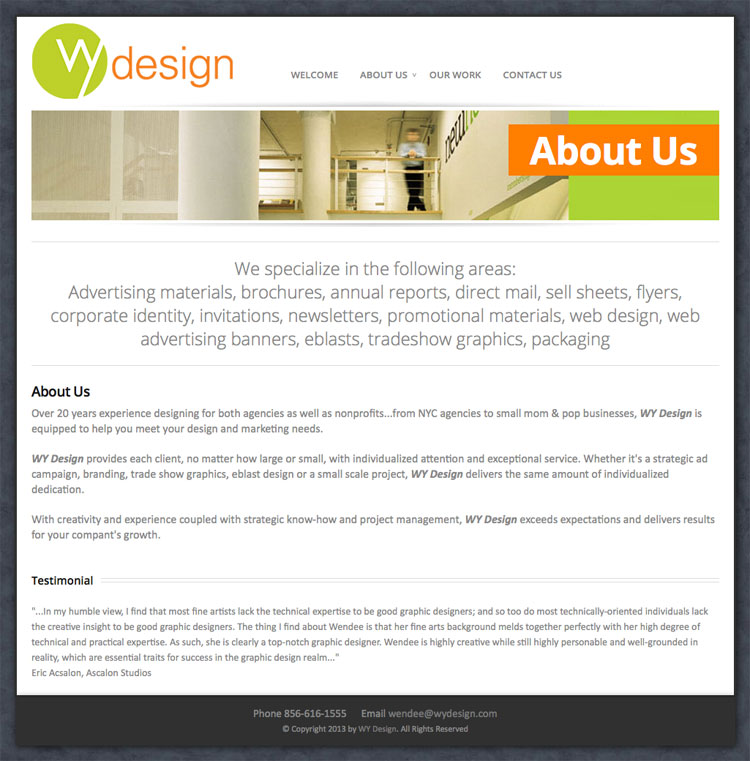 Over 20 years experience designing for both agencies as well as nonprofits...from NYC agencies to small mom & pop businesses, WY Design is equipped to help you meet your design and marketing needs.